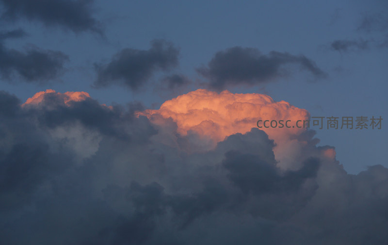 深蓝色的夜幕悄然降临,一簇蓬松的云团被最后的阳光照亮,顶部如熔金般闪耀,与下方幽暗云层形成强烈视觉冲击。