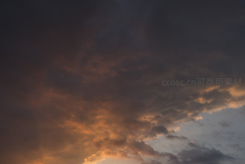 厚重的云层在夕阳余晖下被染成温暖的橙金色,与深邃的灰蓝色天空形成强烈对比,展现出大自然壮丽而宁静的瞬间。
