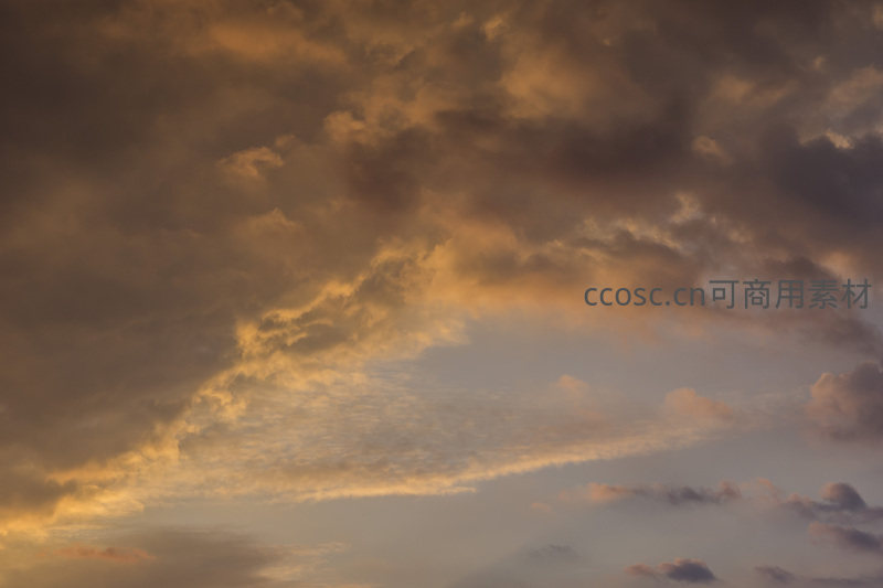 层层叠叠的云朵在落日余晖中泛起金色边缘,仿佛燃烧的火焰铺满天际,营造出温暖而神秘的氛围,是大自然最动人的瞬间之一。