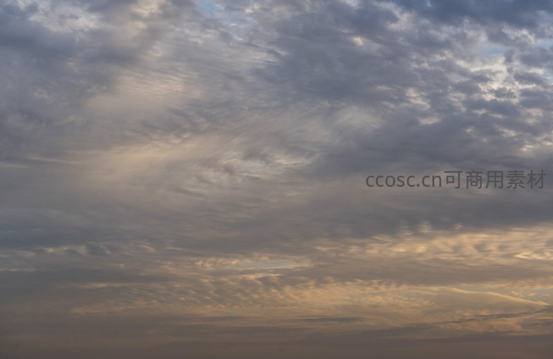 黄昏时分,天空被柔和的金光与深蓝交织渲染,层层叠叠的云朵如画卷般铺展,营造出宁静而壮丽的视觉盛宴。