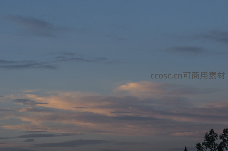 淡紫色的暮色天空飘浮着轻盈云絮,远处树梢勾勒出地平线轮廓,整个画面弥漫着安详、温柔的黄昏氛围。