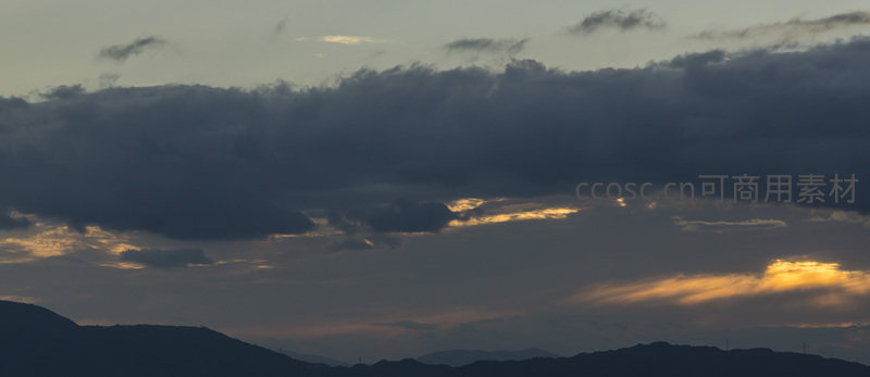 远山轮廓在暮色中化作黑色剪影,厚重云层间透出温暖金光,如神迹般洒向大地,展现自然的恢弘与温柔。