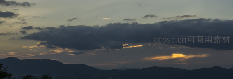 夕阳西下,厚重云层裂开缝隙,金色光芒洒向连绵山峦,天际线染上温暖色调,展现大自然壮丽的光影交响。