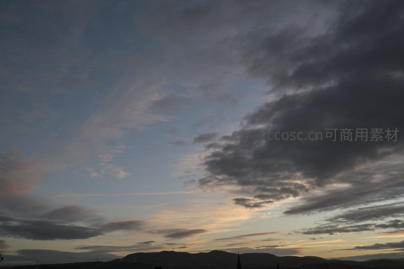 黄昏时分,厚重云层与绚烂晚霞交织,城市建筑与远山轮廓在光影中若隐若现,构成一幅充满诗意与层次感的城市自然融合画面。