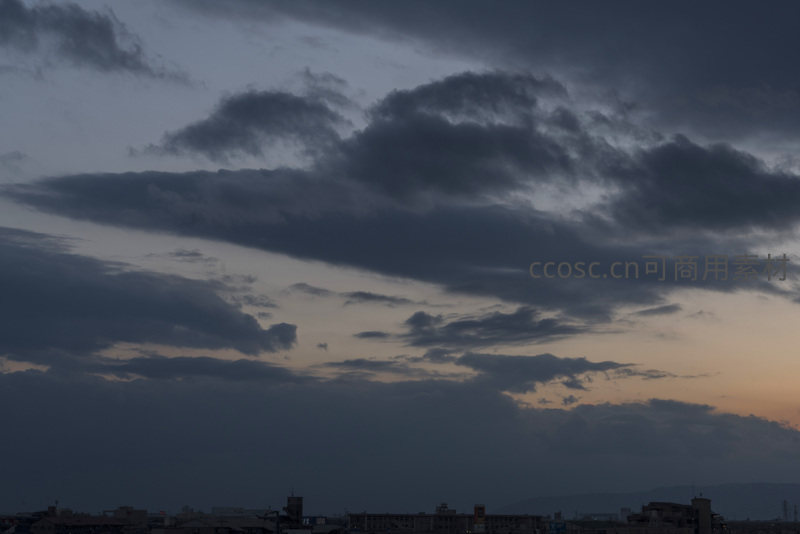 厚重的乌云笼罩着城市上空,夕阳余晖在云层缝隙中透出暖光,城市建筑轮廓在暗色背景下若隐若现,营造出宁静而略带压抑的黄昏氛围。