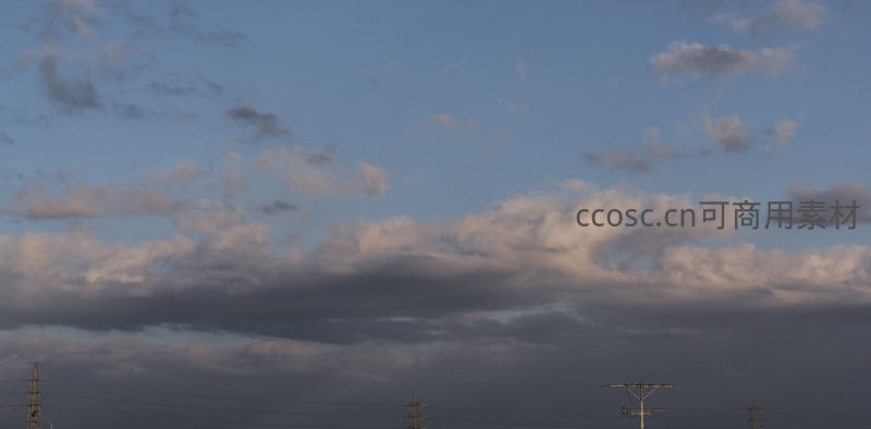 清澈的蓝天上飘浮着蓬松的白色云朵,下方是横亘的输电线路和高耸的电线杆。云层边缘被夕阳染成淡金色,自然美景与现代工业设施在此刻和谐共存。