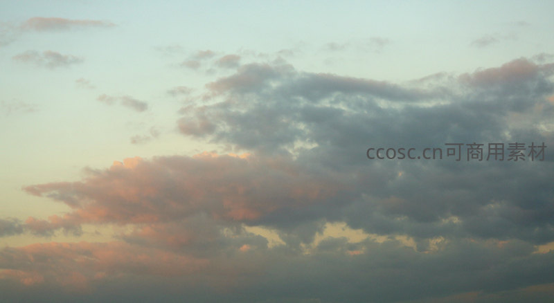 夕阳将蓬松的云团染成绚烂的橘红与粉紫,云朵形态各异,在淡蓝色天幕下自由舒展,构成一幅温暖而梦幻的画面。