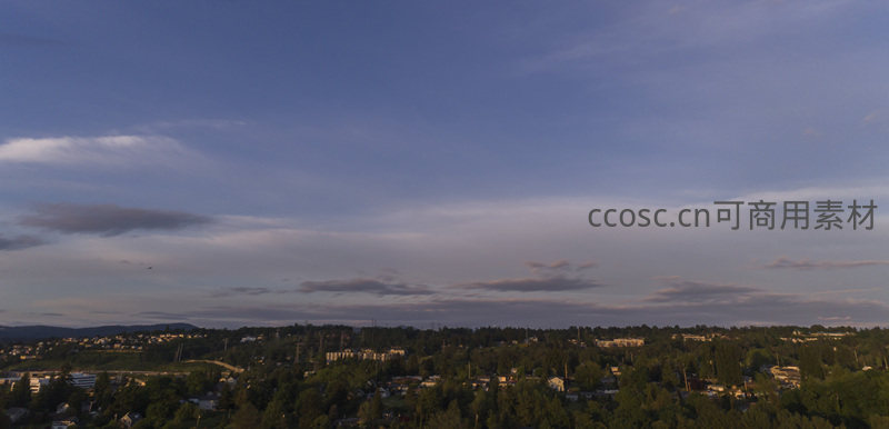 黄昏时分,城市边缘的住宅区被茂密森林环绕,天空中云层层次分明,柔和光线洒在屋顶上,营造宁静祥和氛围。