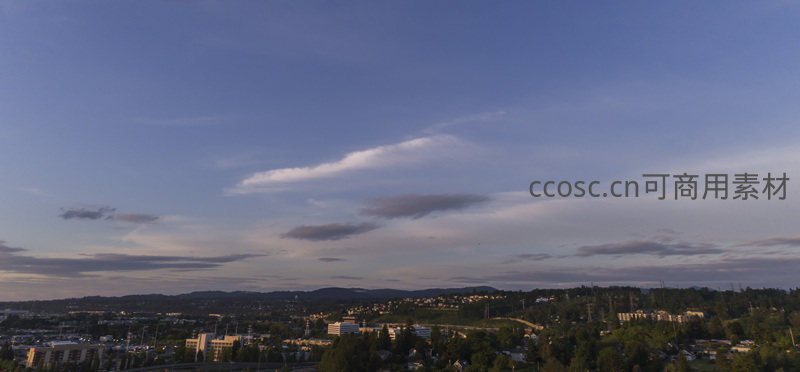 从高空俯瞰城市全景,蓝调天空下云朵轻盈飘动,远处山脉轮廓隐约可见,近处建筑错落有致,绿树成荫,宁静而开阔。