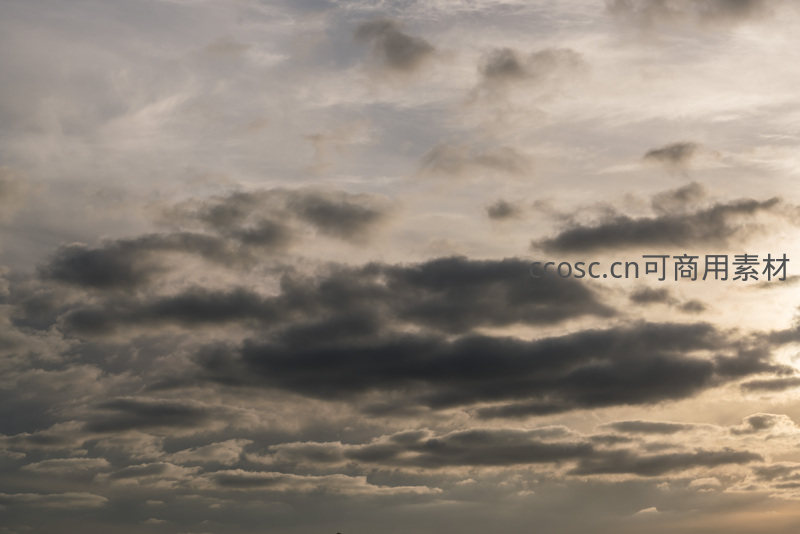 层层叠叠的云朵如海浪般起伏,在黄昏柔和光线的映照下呈现出深浅不一的灰金色调,营造出宁静而梦幻的视觉体验。