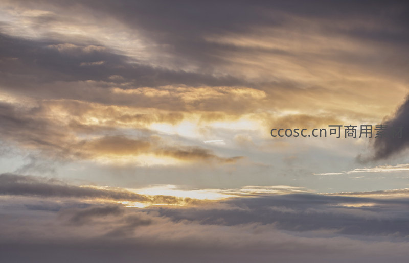夕阳西下,金色光芒穿透厚重云层,在天空中绘出壮丽的画卷,云朵层次分明,色彩由暖黄渐变为深灰,充满诗意与宁静。