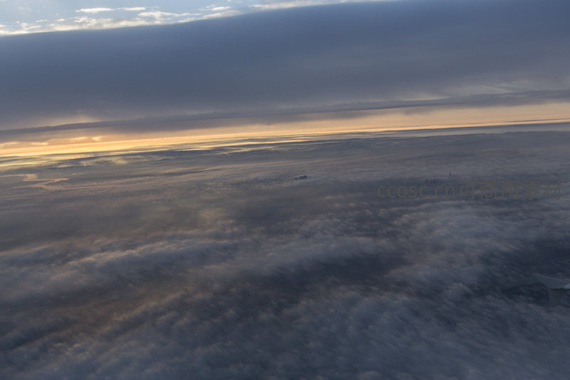 从高空俯瞰,无垠云海如波涛起伏,晨曦穿透云层洒下金光,远处城市轮廓若隐若现,展现飞行途中独特的视觉盛宴。