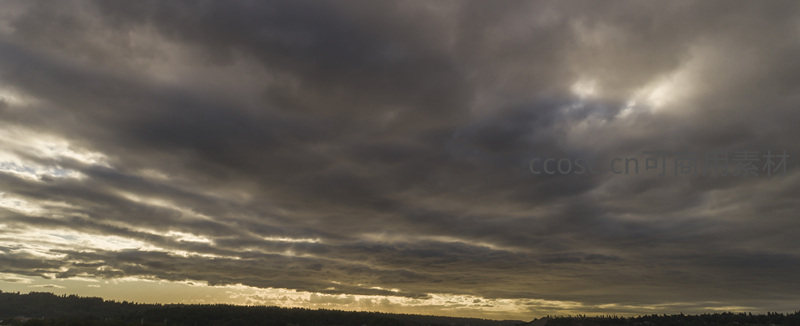 厚重的云层在黄昏时分铺满天际,阳光穿透缝隙洒下金色光束,远处地平线森林剪影清晰,营造出壮阔而宁静的自然氛围。