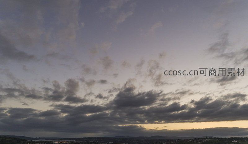 层层叠叠的云朵在暮色中变幻形态,低垂云底透出暖黄光晕,下方城市灯火初上,构成一幅动静结合的城市黄昏画卷。
