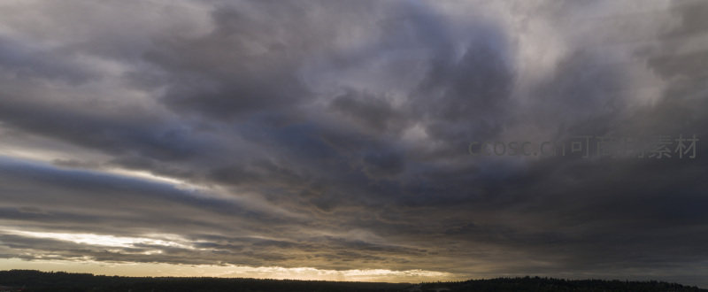 低垂的积雨云层如巨幕般笼罩大地,边缘透出微弱金光,预示着一场风雨即将来临。地平线上的森林剪影更添几分肃穆与苍凉之感。