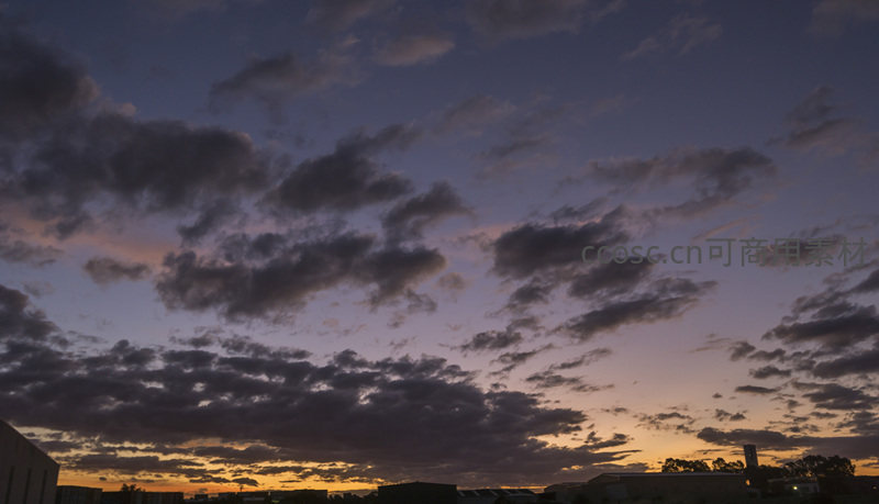 暮色中紫色与橙黄色调交融于天幕,蓬松云朵如絮般漂浮,城市建筑群在下方形成剪影,构成一幅梦幻而宁静的都市黄昏画卷。