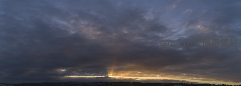 厚重云层中裂开一道缝隙,金色阳光如利剑般倾泻而下,照亮远方地平线与林木,营造神圣而震撼的视觉奇观。