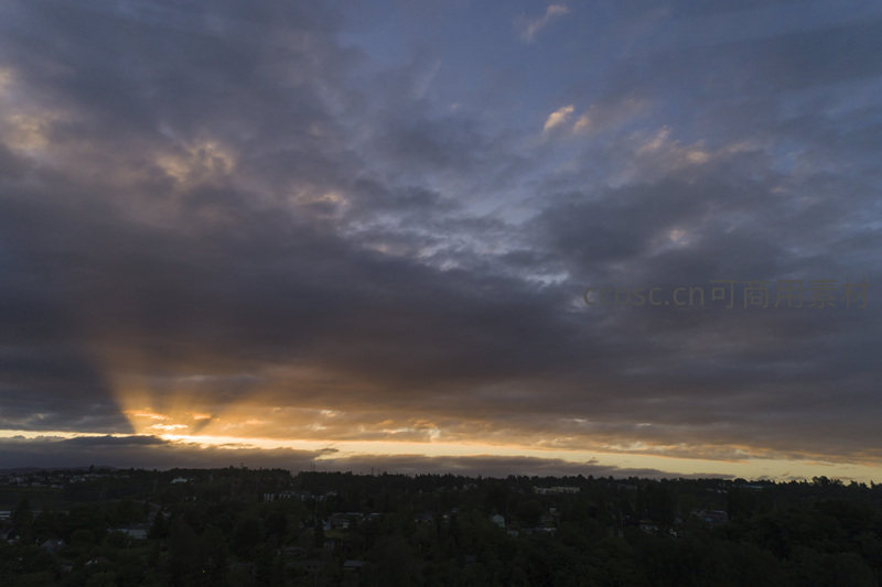 高角度俯瞰城市上空的破云霞光