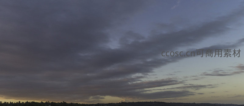 大片灰蓝色云层低垂,笼罩着远方起伏的林线,天边透出微弱的橙黄光晕,整个画面静谧而深远,仿佛时间在这一刻凝固。