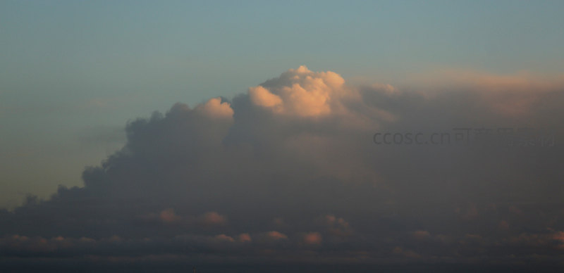 庞大的积云如山峦般矗立于天边,顶部被夕阳染成明亮金黄,底部则隐入暗影,形成强烈明暗对比,气势恢宏。
