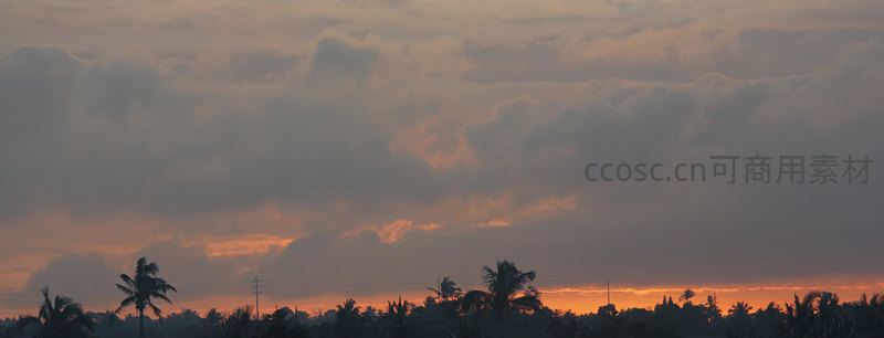 热带棕榈树剪影在橙红夕阳下清晰可见,背后是翻滚的云海,构成一幅充满异域风情与诗意的黄昏画卷。