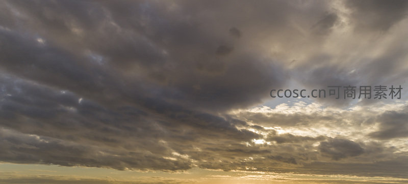 太阳即将沉入地平线,其光芒穿过厚重云层,在下方投射出斑驳陆离的金色光束,为整个天空披上一层梦幻般的暖色调。