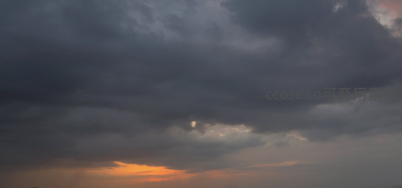 厚重乌云笼罩天空,却在低处裂开一道缝隙,透出温暖的日落余晖,形成强烈对比,充满戏剧性张力。