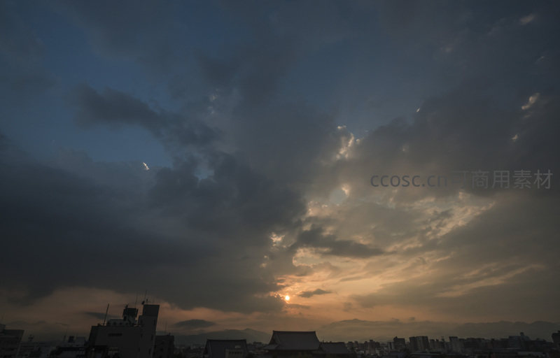 传统寺庙屋顶在暮色中静默伫立,被绚烂霞光温柔包裹,与现代城市轮廓和多变云层共同构成一幅和谐画卷。