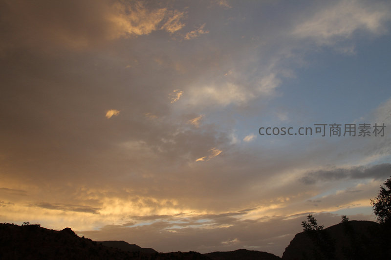 连绵的山峦在地平线上勾勒出深色剪影,上方是被夕阳染成金黄与橙红的云海,光线柔和地洒满天空,展现出大自然鬼斧神工的色彩与层次之美。