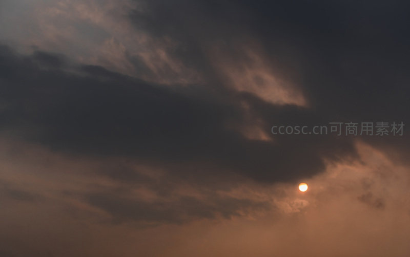 一轮小小的夕阳被浓密、翻滚的云层半遮半掩,仅透出一点温暖的光芒,整个画面笼罩在深沉的暮色中,营造出一种静谧、略带神秘的黄昏氛围。
