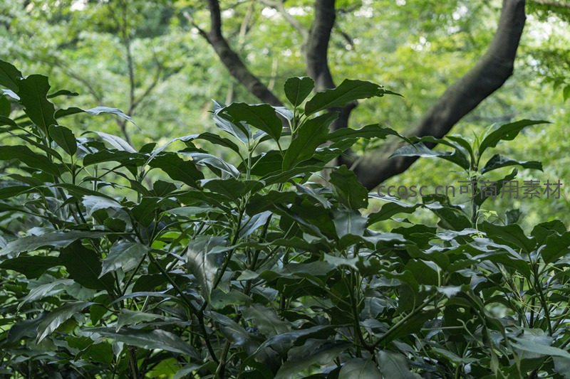 镜头聚焦于一丛鲜嫩的绿叶,叶片脉络清晰,边缘微卷,在柔和的林间光线下显得格外富有生命力,展现自然的细腻之美。