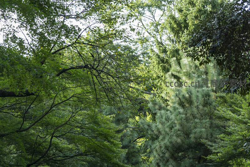 从低处仰望,层层叠叠的树冠交织成一片绿色天幕,阳光穿透缝隙洒下点点金光,松针与阔叶共同谱写森林的静谧交响。