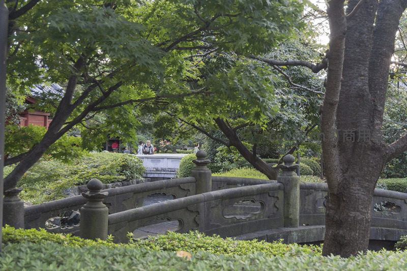 一座古朴的石桥横跨在绿意盎然的园林中,枝叶繁茂的树木为其投下斑驳的阴影,远处游客悠然穿行,尽显古典园林的静谧与雅致。
