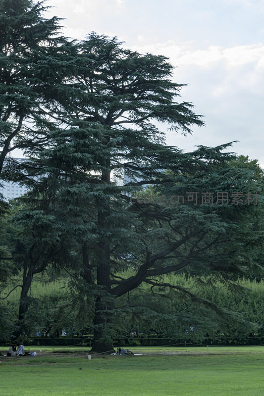 一棵高大挺拔、枝干苍劲的雪松静静伫立在开阔的草坪上,深绿色的针叶层层叠叠,如同撑开的巨大华盖,为下方休憩的人们提供阴凉。