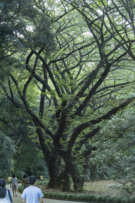 巨大的古树枝干交错,形成天然的绿色穹顶,几位游客在树下小径上缓步前行,享受着林间清风与斑驳光影,感受自然的宁静与宏伟。