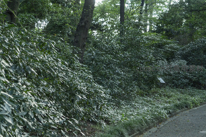 道路一侧被浓密的灌木丛覆盖,绿意扑面而来,与远处高耸的树木相映成趣,构成一幅生机勃勃、充满生态美感的街景图。