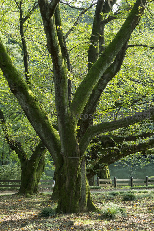一棵枝干粗壮、布满青苔的古老大树矗立在林间,阳光透过浓密的树叶洒下斑驳光影,营造出宁静祥和的自然氛围。