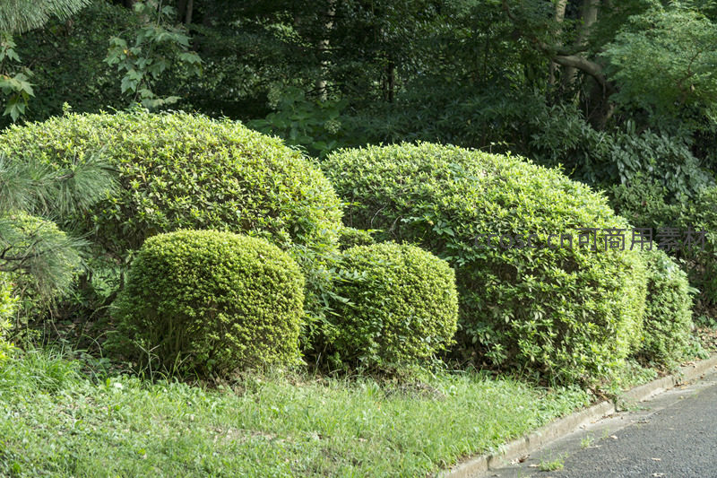 路边精心修剪成球形的翠绿灌木丛,与背景中的茂密树林相映成趣,展现出人工与自然和谐共存的优美园林景观。