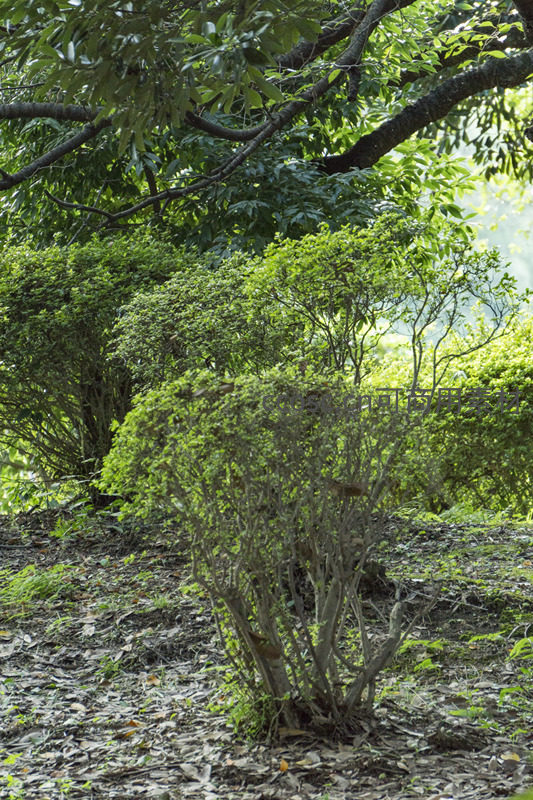 一丛新生的灌木在林荫下悄然生长,枝条舒展,叶片嫩绿,周围铺满枯叶,展现出大自然生生不息、充满野趣的生命力。