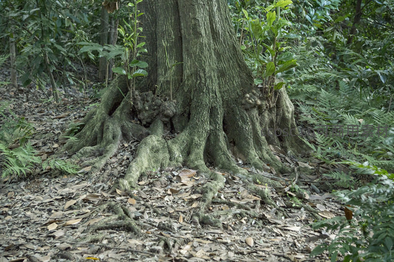 森林巨树根系盘踞于落叶覆盖的地面
