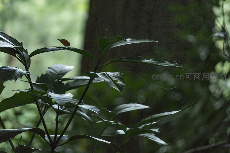 蛛网轻挂枝叶,幽暗森林中的静谧一角