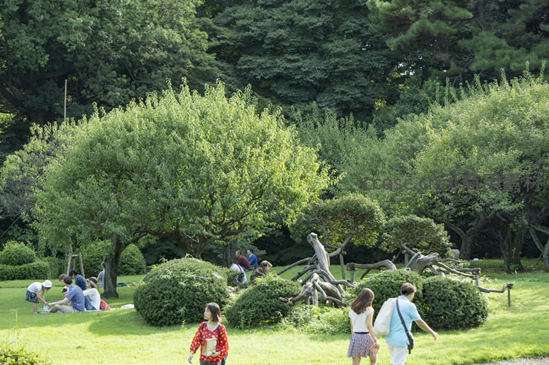 草坪上游客或坐或行,享受阳光下的悠闲假期