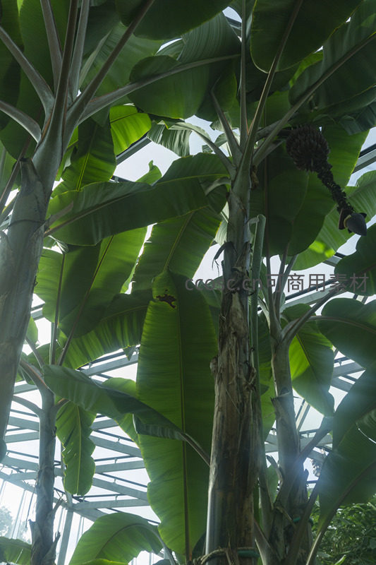 仰拍视角展现芭蕉树宽大叶片与垂挂的果实,阳光透过玻璃屋顶洒落,形成明暗交错的光影效果,充满热带雨林的湿润气息。