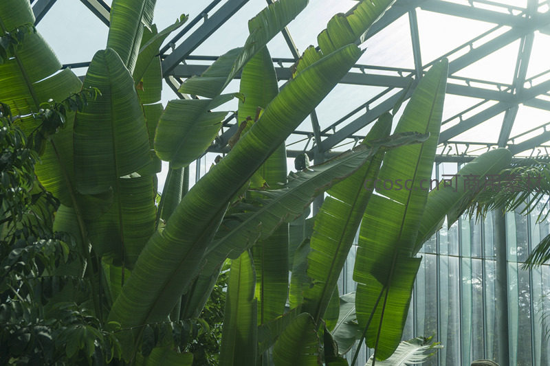 在现代化的玻璃温室里,巨大的芭蕉叶片层层叠叠,沐浴在透过屋顶洒下的柔和阳光中,展现出旺盛的生命力与宁静的自然之美。