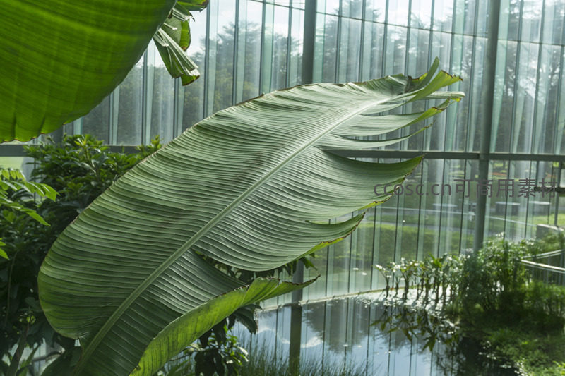 一张精美的微距特写,捕捉了芭蕉叶上清晰分明的平行叶脉,背景是朦胧的温室玻璃墙和水池倒影,突显了植物的精致结构与自然韵律。