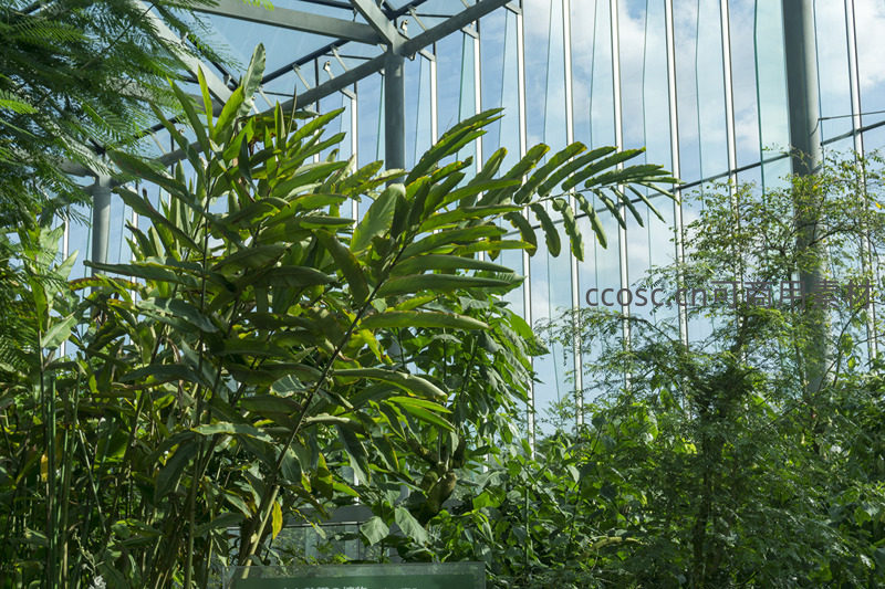 温室玻璃顶下绿叶随风轻摇曳