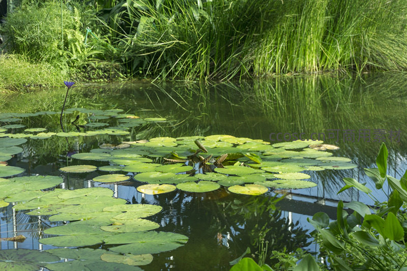 清澈的池塘中,碧绿的荷叶铺满水面,几朵紫色睡莲静静绽放,岸边青草茂盛,倒影如画,营造出一片宁静祥和的自然景象。