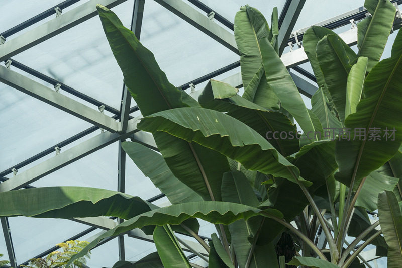 从下向上仰拍,巨大的芭蕉叶与现代感十足的钢架玻璃顶棚交相辉映,光线透过缝隙洒落,展现结构与自然的美学融合。