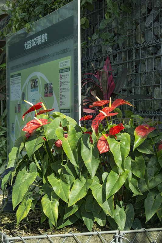 阳光下,鲜艳的红掌花在翠绿叶片间绽放,背景是介绍温室利用的导览牌,展现了植物园内生机勃勃的景象。