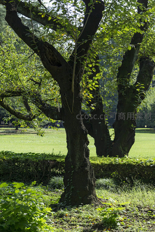 粗壮的古树枝干遒劲,浓密的绿叶在阳光下熠熠生辉,树下是修剪整齐的灌木和青翠草坪,构成一幅宁静和谐的自然画卷。